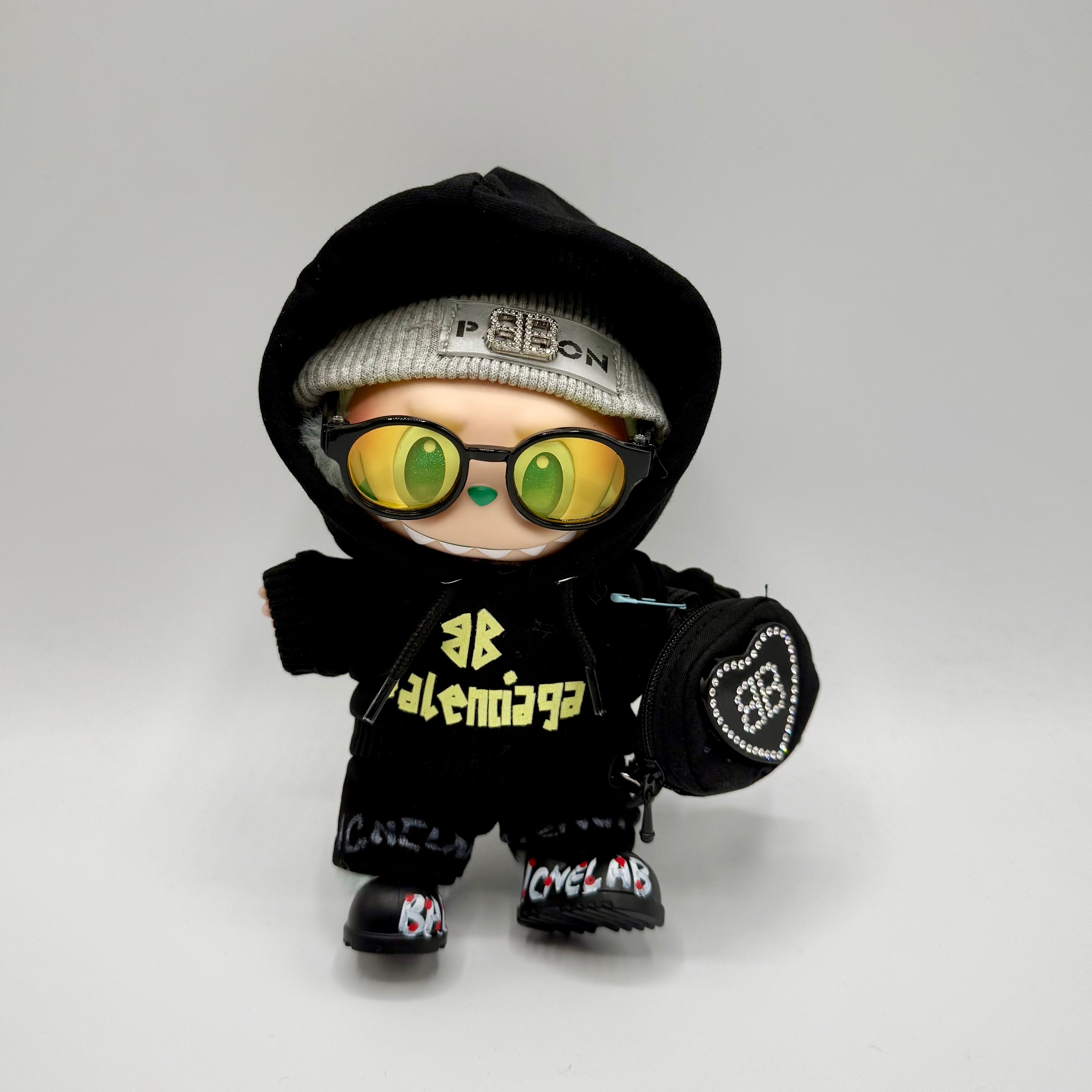 Bring edgy street style to your Labubu collection with this sleek black hoodie outfit set. Features a logo hoodie and sweatpants, chunky sneakers, reflective sunglasses, silver-patch beanie, and a rhinestone-trim heart-shaped mini bag. Perfect for collectors who love statement-making looks